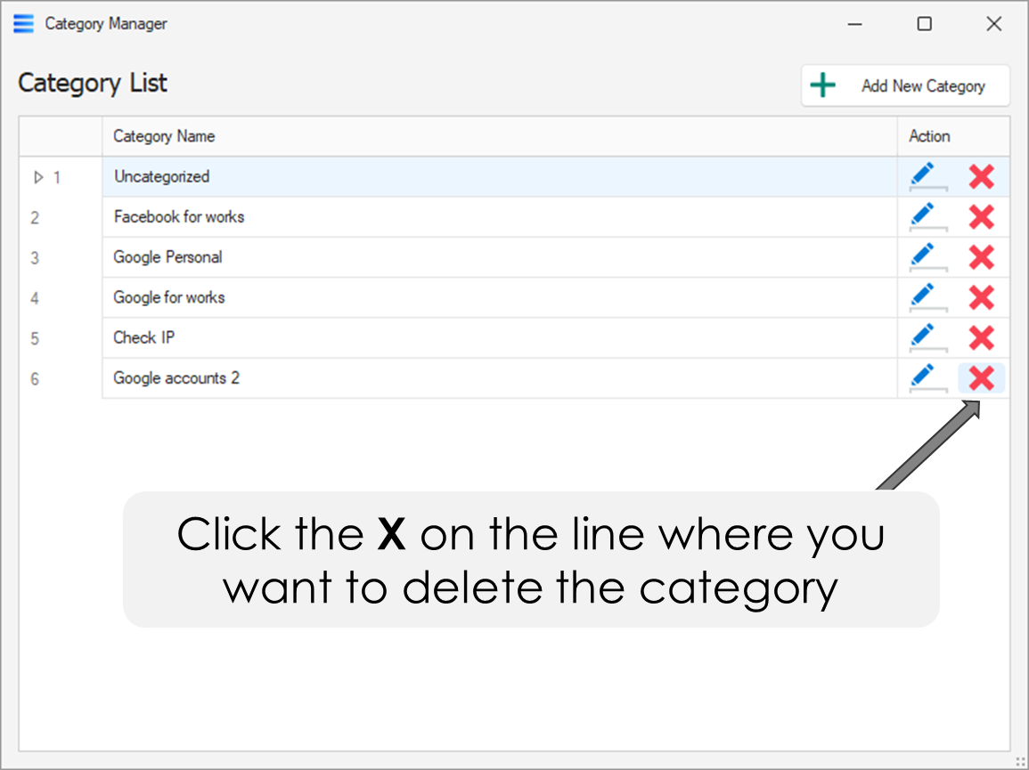 {% hint style="info" %} <mark style="color:blue;">Click the</mark> <img src="https://1601566884-files.gitbook.io/~/files/v0/b/gitbook-x-prod.appspot.com/o/spaces%2FYeZmDd8d0626QWz0oz1w%2Fuploads%2Fw8RzaCGOWqSC0izFgilk%2Fx-button.svg?alt=media&#x26;token=59c1fe1f-7aab-4bb6-a89a-629a80bcdc5f" alt="" data-size="line"> <mark style="color:blue;">on the line where you want to delete the category</mark>