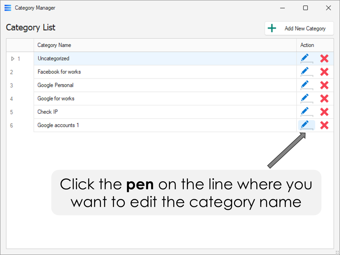 {% hint style="info" %} <mark style="color:blue;">Click the</mark> <img src="https://1601566884-files.gitbook.io/~/files/v0/b/gitbook-x-prod.appspot.com/o/spaces%2FYeZmDd8d0626QWz0oz1w%2Fuploads%2F0pIQ1wvg72zvDi5Ly01A%2Fpen.svg?alt=media&#x26;token=99cb8e34-4ada-42de-b5d6-4ca2cb67fe3d" alt="" data-size="line"><mark style="color:green;">**pen**</mark> <mark style="color:blue;">on the line where you want to edit the category name</mark>